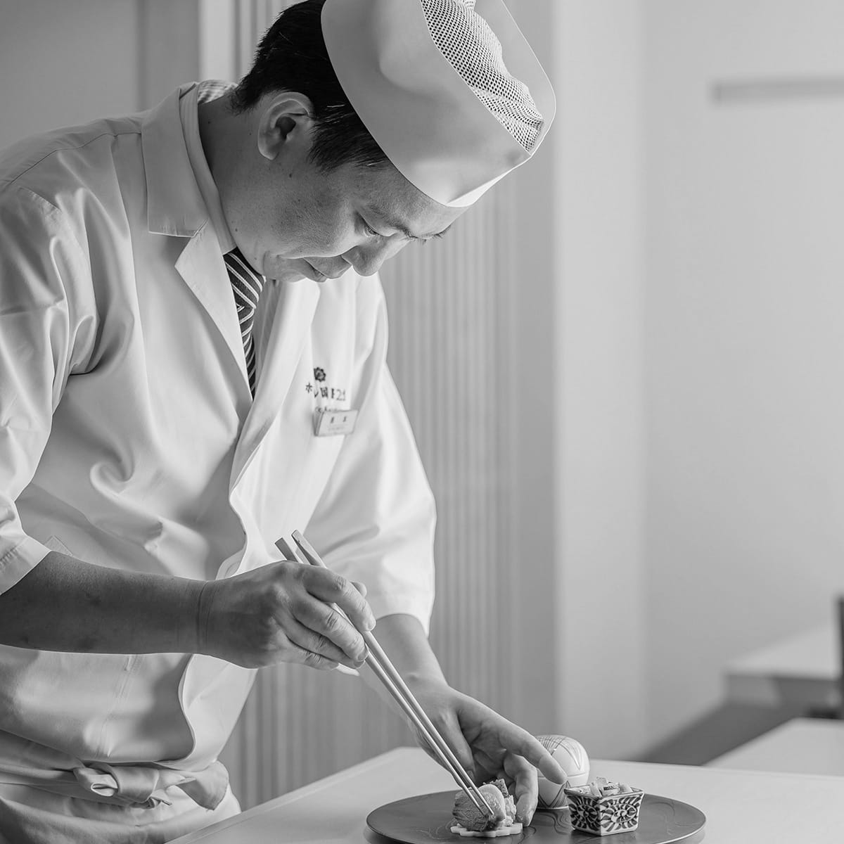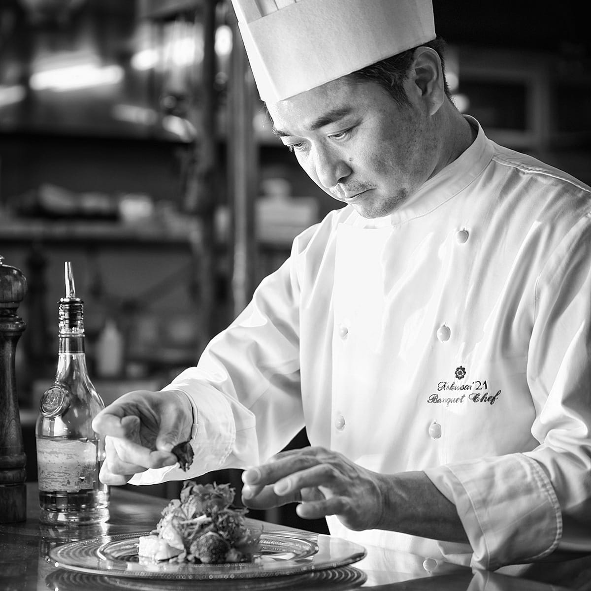 様々なレストラン、ホテルの厨房での豊富な経験を経て、現在は当館の総料理長として料理全般を統括。フレンチを得意としながらも、伝統的な会席から和洋折衷の創作料理まで、多彩なレパートリーを展開する。四季折々の最良の食材を見極め、一皿一皿に祝宴にふさわしい気品と温かみを込めてお作りします。
