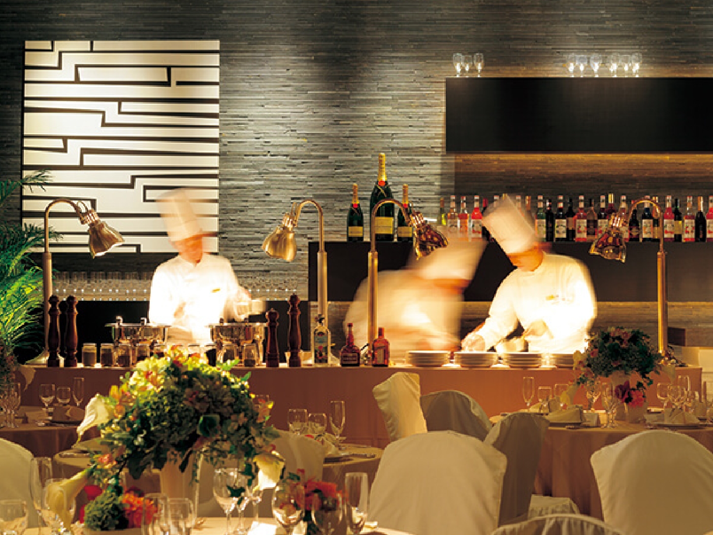 本格的なライブキッチンから繰り出される美しい婚礼料理。ホテルシェフの繊細な調理を見ながらご提供し、よりゲストにお料理を楽しんでいただける空間を演出します。