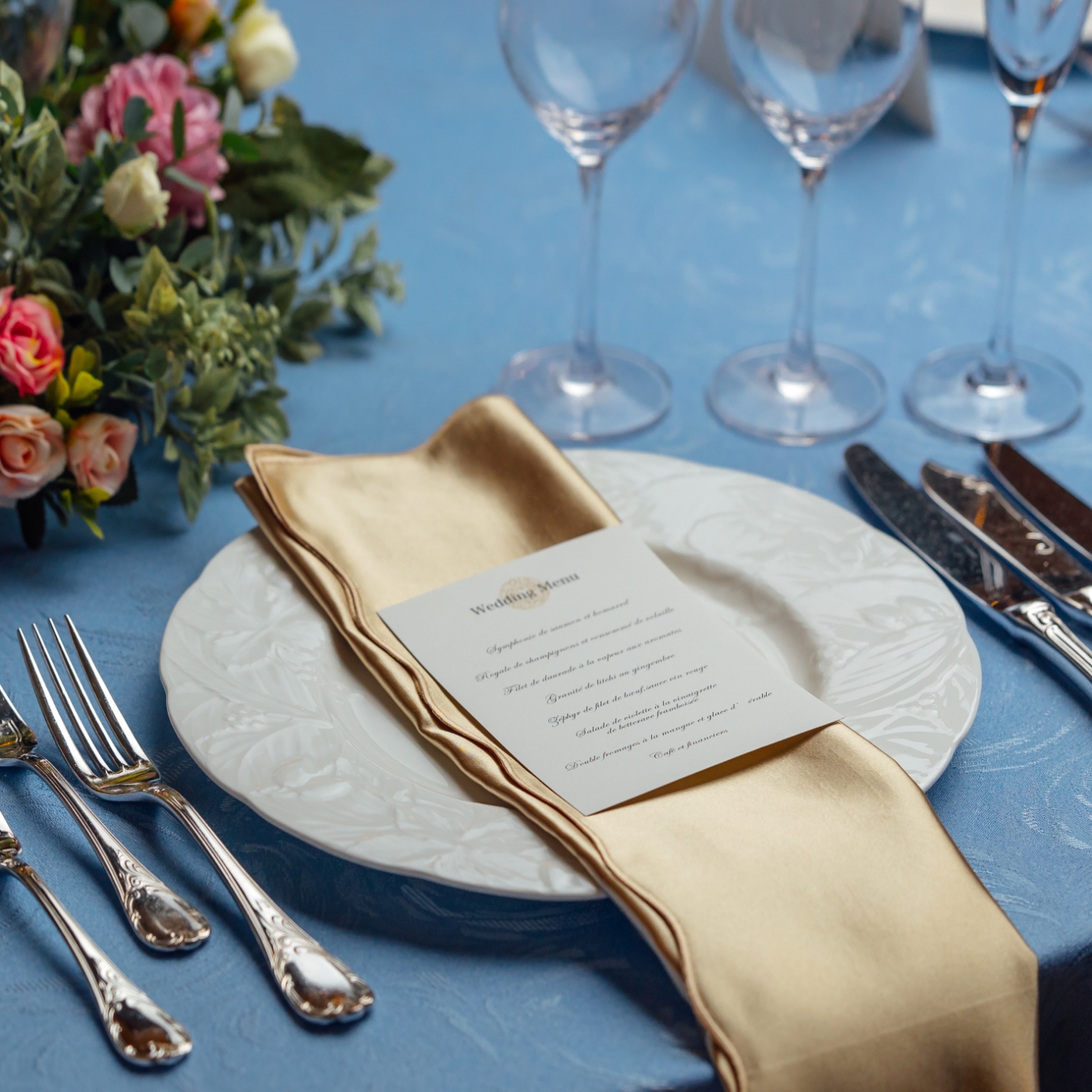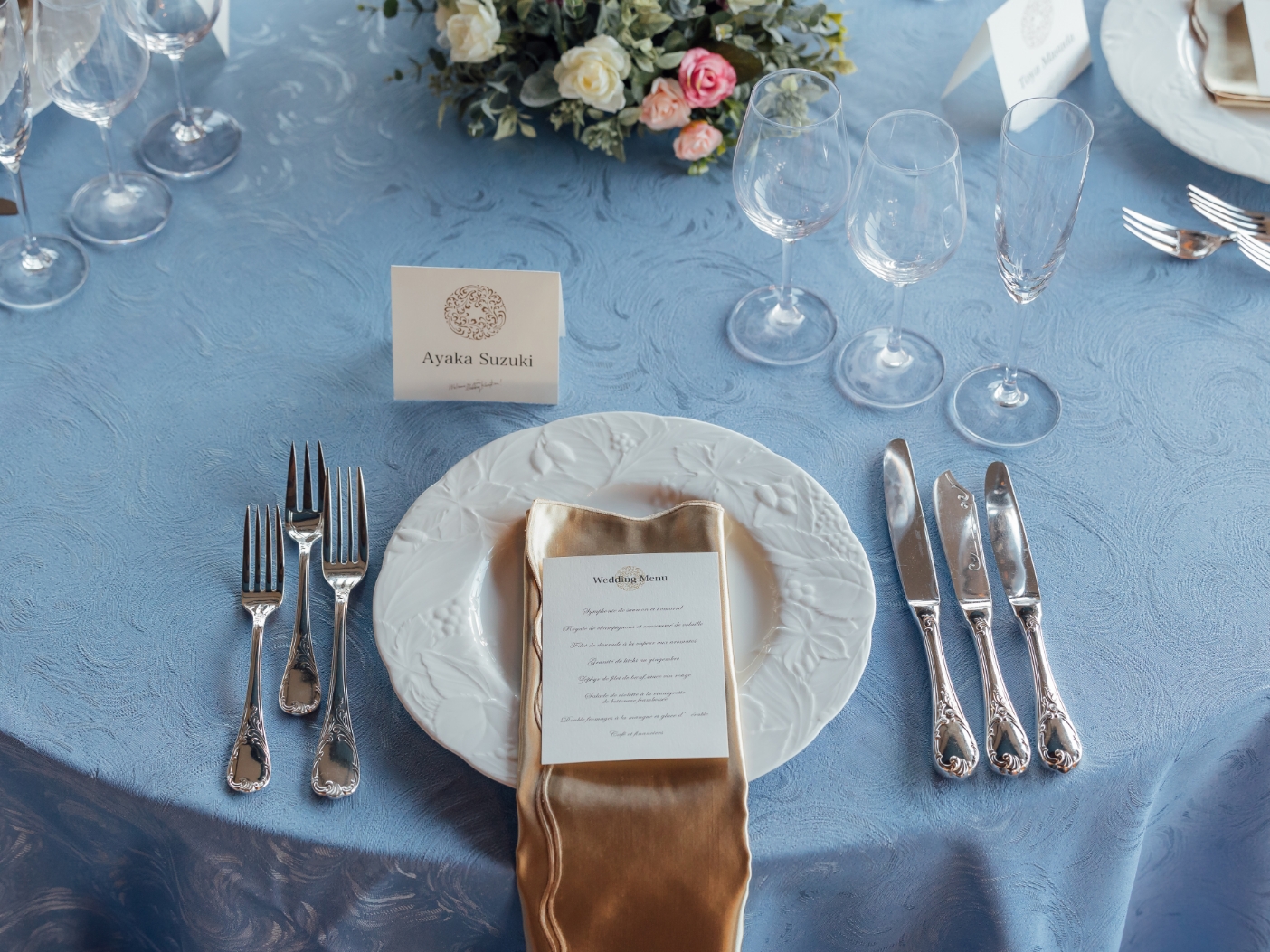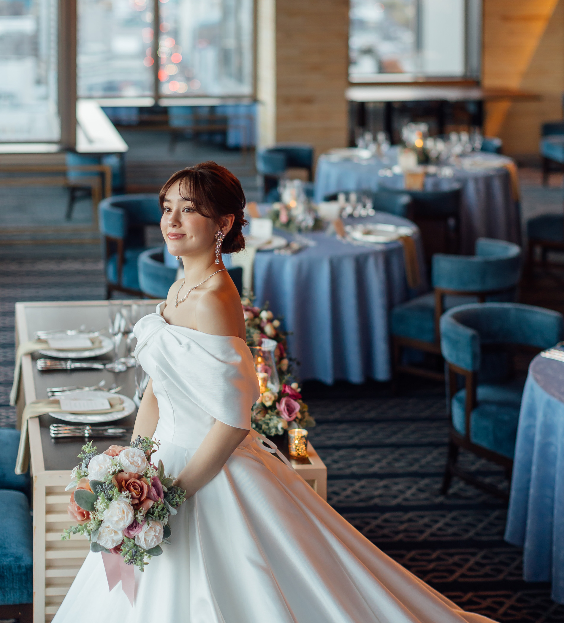 濃紺を基調としたBoulangerはどんな色の装花・テーブルコーディネートも映える会場。おふたりらしいテーマカラーを決めて、会場全体を染め上げます。
