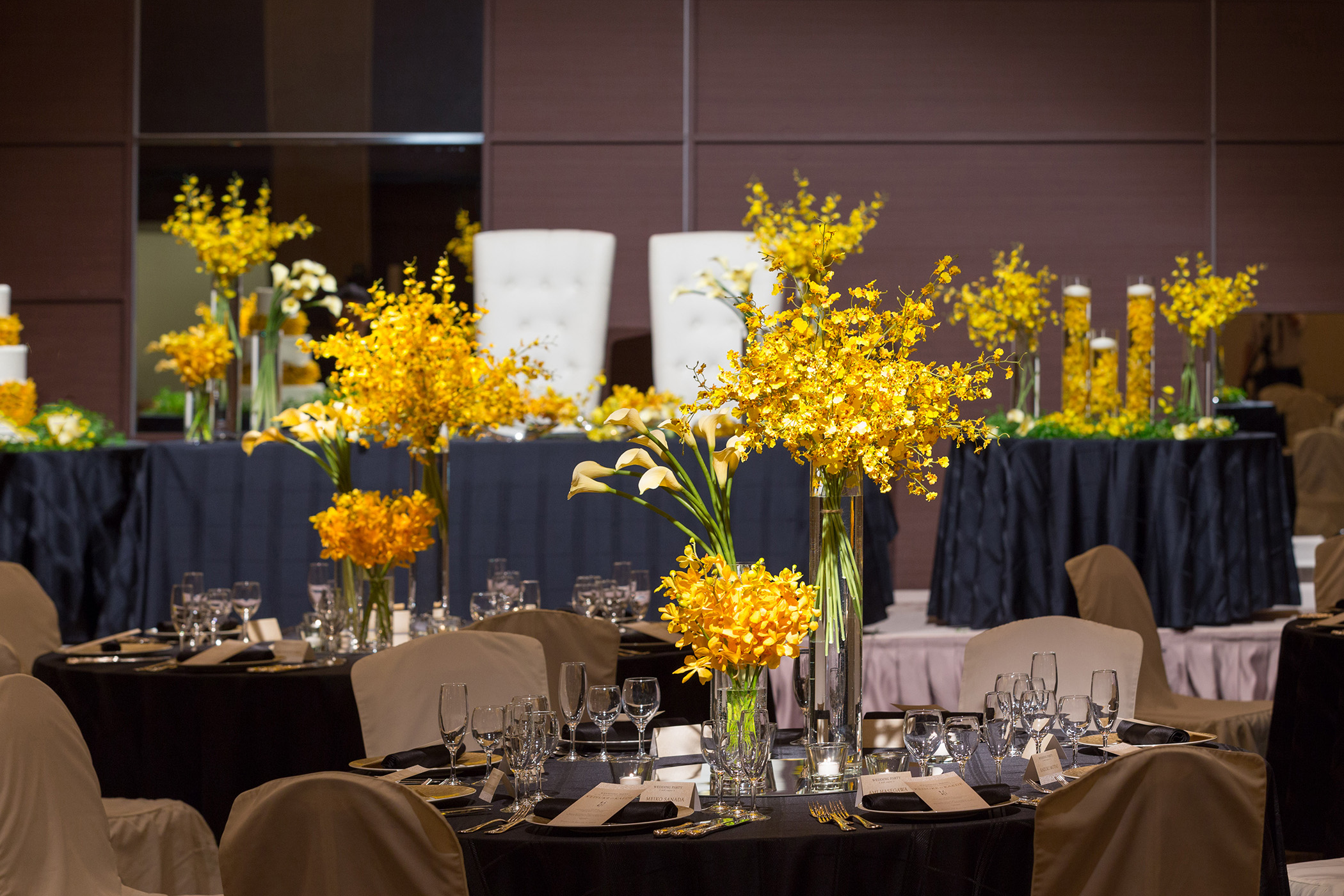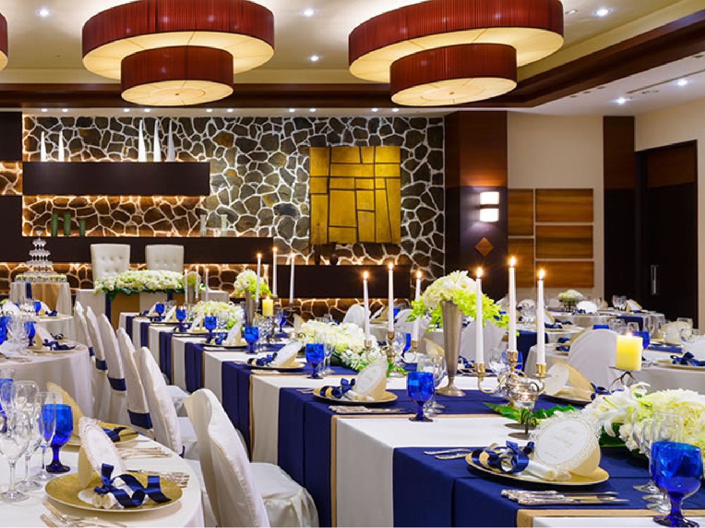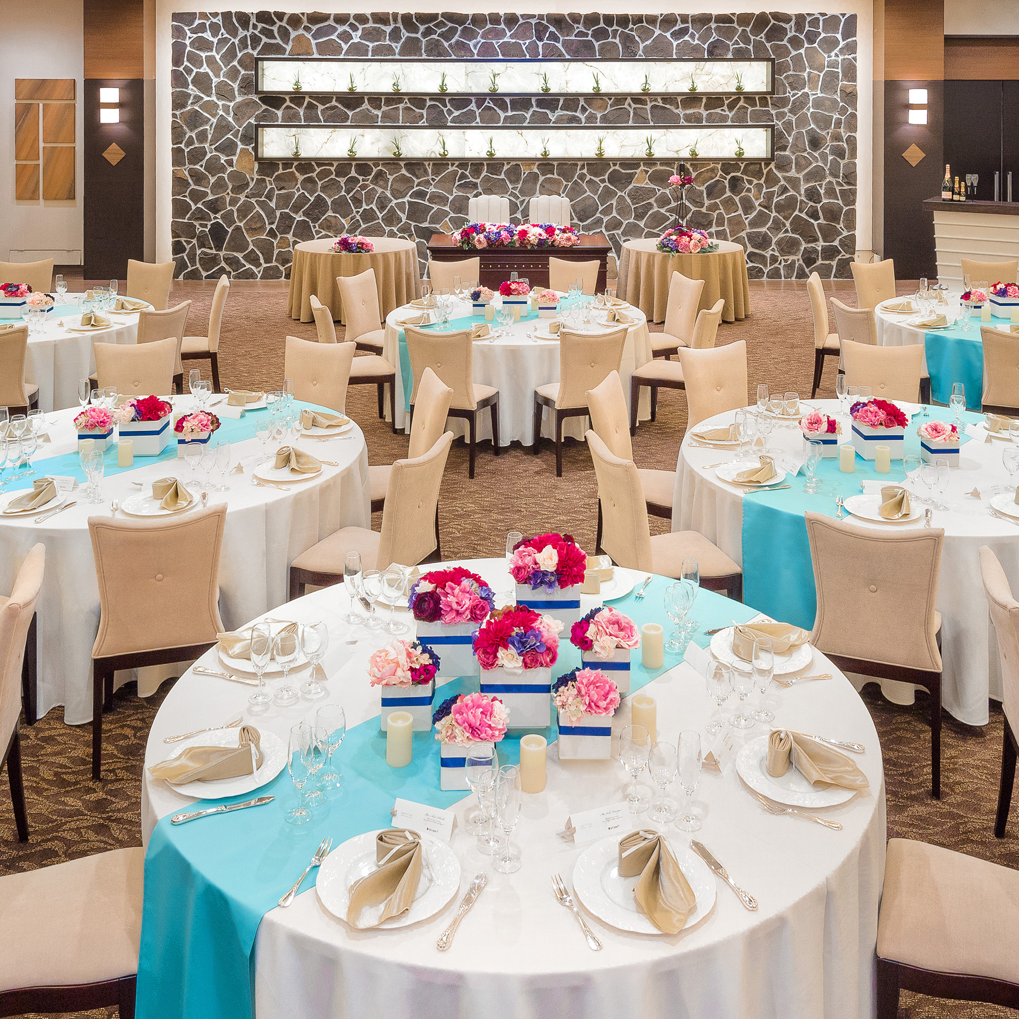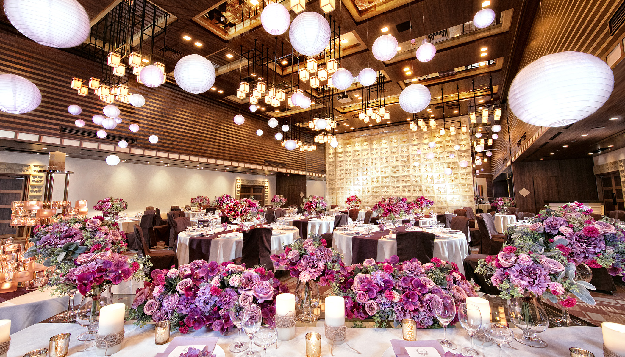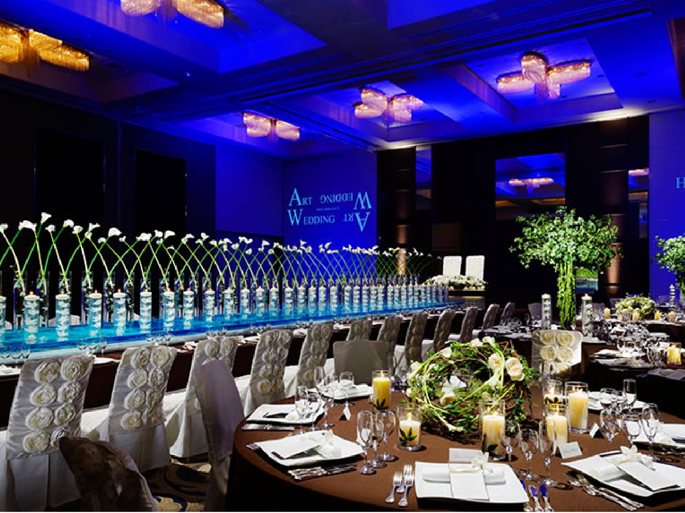 披露宴会場はどこも天井が高く、シャンデリアや壁面などが個性的な会場が多いのが特徴。各会場ごとの素材感を合わせ、シャンデリアの光を活かした会場作りが可能です。